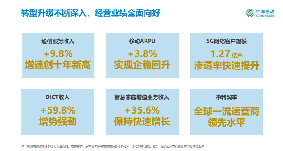 为把握数字经济机遇,中国移动围绕“数智化转型”,持续巩固网络能力,深入推进创新驱动,大力推动智慧运营,强化与产业各方合作共赢,深化机制改革突破,面向未来的可持续发展能力不断增强。