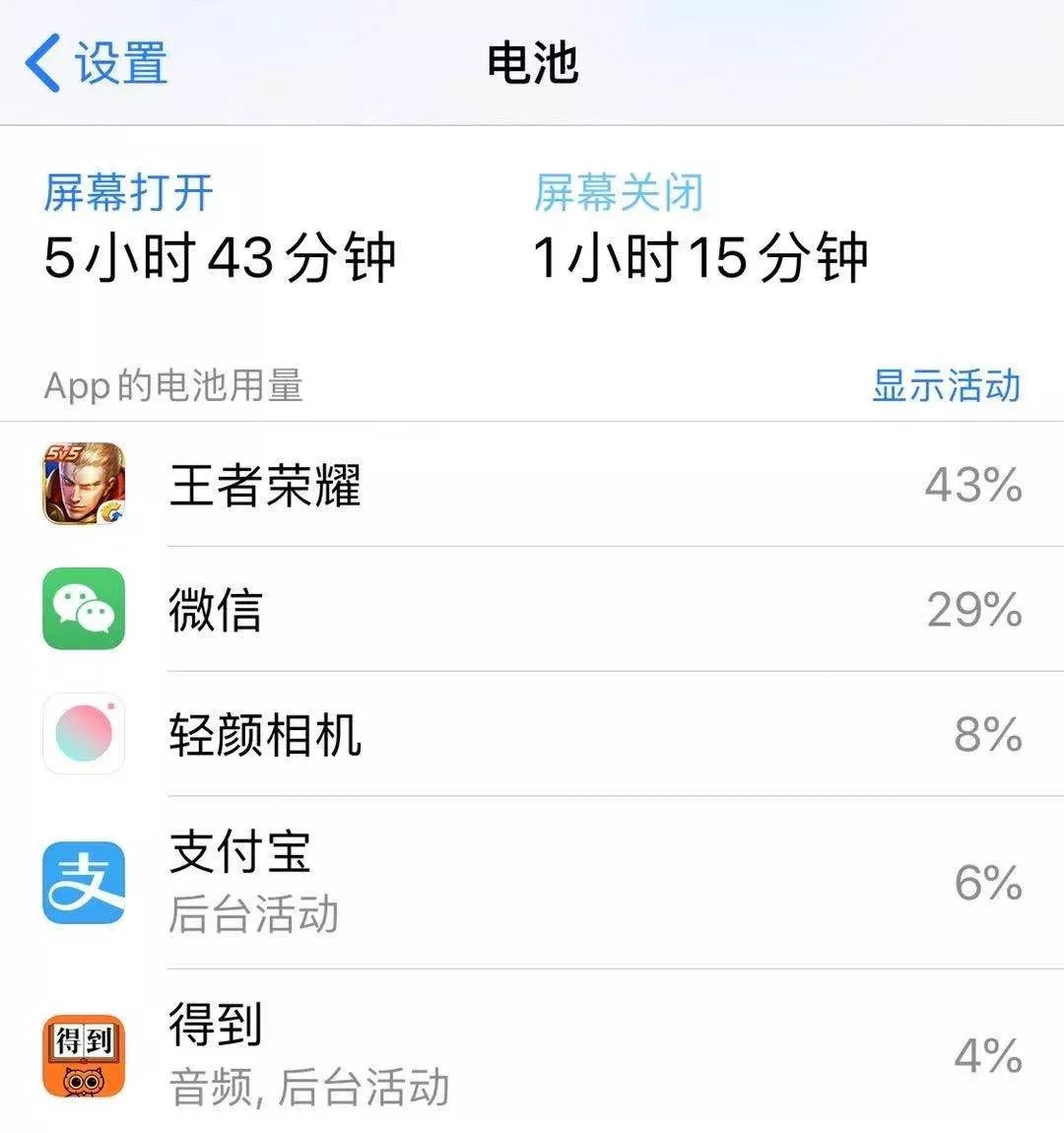 方法:找到【设置】—【电池】,往下滑,就能快速查到过去一段时间内最耗电的APP排行,找到那个罪魁祸首!