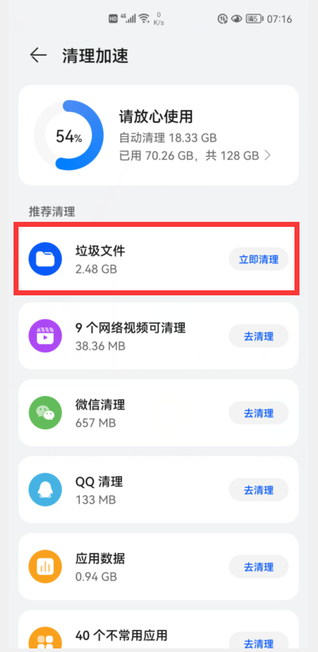 在这个界面,我们可以看到很多的清理选项,第一项“垃圾文件”,这个必须操作的,从上图中可以看到,我手机的里已经有2.48G的垃圾了,点击后面的“立即清理”,就可以把这些垃圾清理掉,释放出2.48G的内存空间。下面几项,如微信清理、QQ清理等等,我们可以根据自己的具体情况来操作,清理时就要注意了,如果有重要的数据,就要提前做好备份。