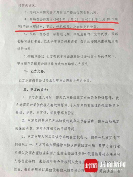 高先生提供给封面新闻记者的协议图片显示,2013年,在办理完过户手续后,他又与移动丽江分公司签订了“吉祥号码协议”,双方约定,高先生购买移动丽江分公司的电话网络服务套餐,每月保底消费888元,自2013年1月29日起,至2018年1月28日期间,不能办理过户、更名、停机保号、及套餐变更业务。