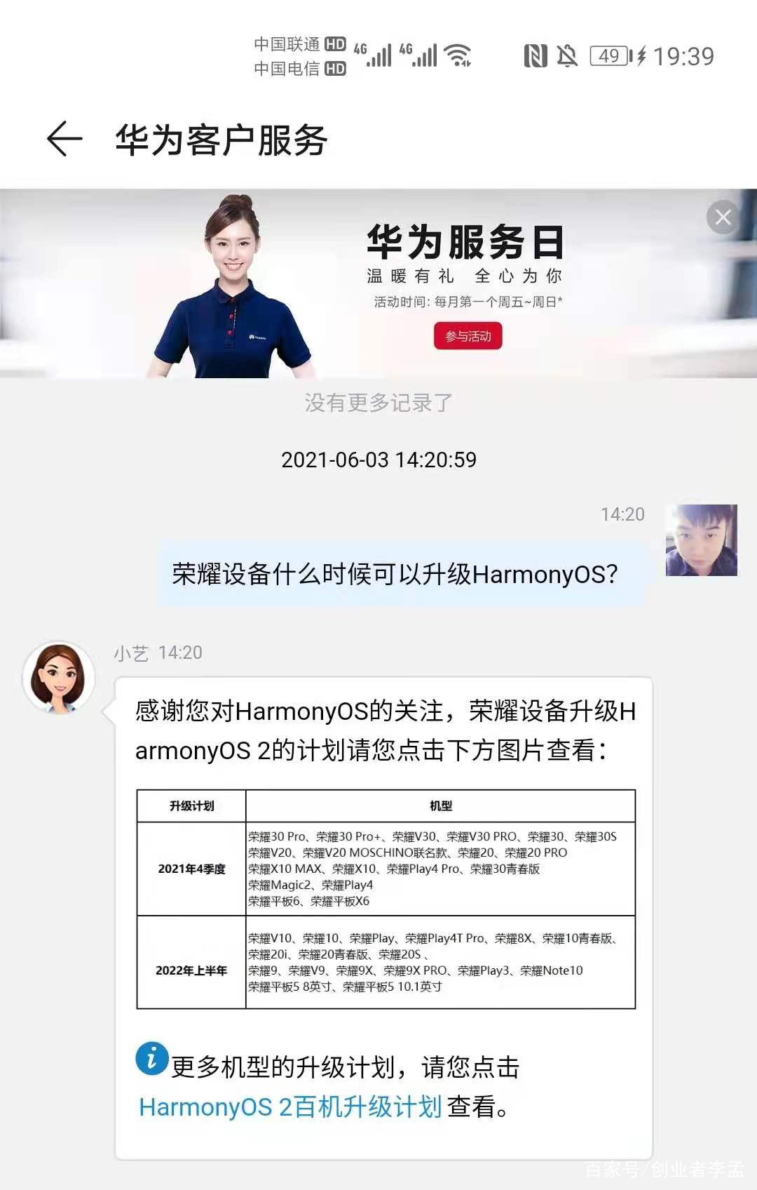 最后通过我的荣耀手机打开了服务的APP,这里有升级尝鲜,点击没有办法响应,无法申请,但是我点击了我的华为客服功能,当点击开之后,就有一个自动对话的问题,那就是“荣耀设备什么时候可以升级HarmonyOS”,当点击之后就出现了荣耀设备升级鸿蒙OS 2的计划图片就展开了!