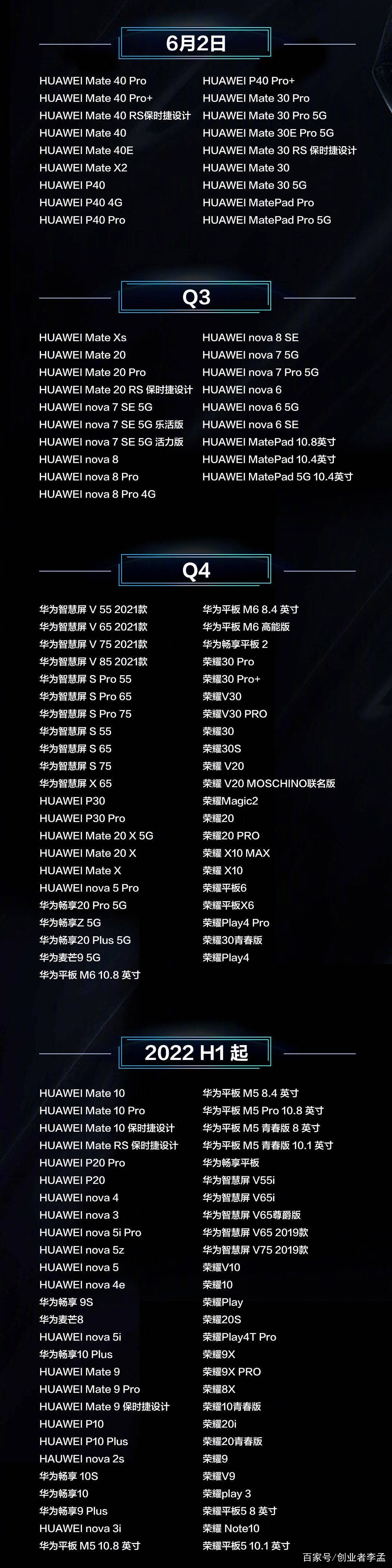 2021年Q4具体可以升级的机型为:荣耀30系列(包括30S、青春版)、荣耀V30、荣耀V20、荣耀20系列、荣耀X10系列、荣耀平板6/X6、荣耀Play4系列、荣耀Magic2等。2024年上半年更老旧的荣耀手机也可以陆续升级到鸿蒙,具体为荣耀V10、荣耀10、荣耀Plya、荣耀20S、荣耀9X系列、荣耀8X、荣耀10、荣耀20i、荣耀20青春版、荣耀9、荣耀V9、荣耀Play4T Pro、荣耀Play3、荣耀平板5系列、荣耀Note10。以上机型基本也算是将荣耀最近2~3年的机型都包括在内了。