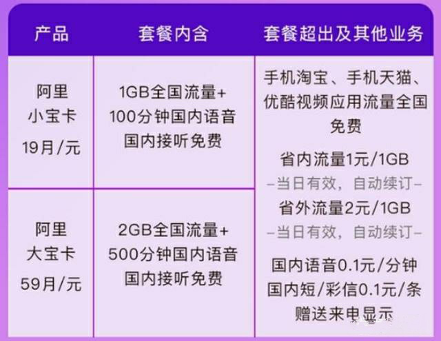 这款套餐主要是分为阿里19元小宝卡套餐和阿里59元大宝卡套餐,其套餐内主要的区别是,阿里小宝卡套餐每个月有1GB的全国流量和100分钟的国内语音免费接听,阿里大宝卡则是每个月2GB的全国流量和500分钟的国内语音免费接听。