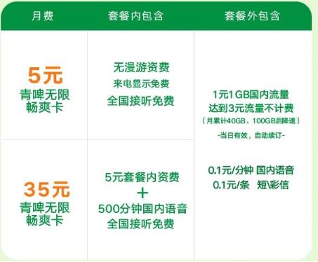 套餐分为5元和35元的,差别就在于35元送国内通话时间,