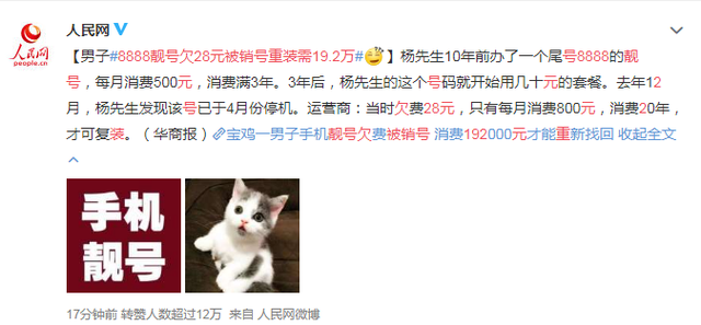 8888手机靓号欠费28元被销号,重装需消费192000元!网友炸锅2020-12-22 阅读(110)关键词: 手机靓号