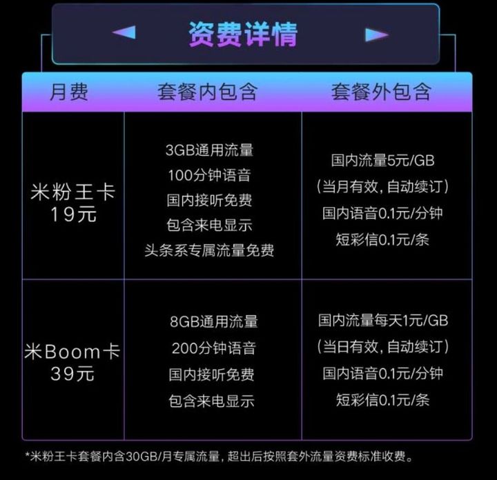米粉卡分两种套餐,一种是19元的米粉王卡,另外一种就是米Boom卡(这个是前两个月刚推出的),两者的资费是不同的,国内流量最低是1元1个月G,套餐内包含500分钟通话分钟数,可设置5个亲情号码。