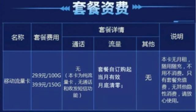 最划算的当属物联卡,但是物联卡仅支持流量,不支持语音通话、短信业务,只能够当做副卡来使用。物联卡的另外一大特色,那就是没有月租费用,当月不产生流量就不会扣取任何费用。很多人无法确定物联卡的信号问题,仅需要购买尝试一下即可,最多的也只是损失一个月的资费而已。例如下图所示的物联卡资费,29.9元的价格便可以购买100G流量。这里的100G流量并非互联网卡的定向流量,而是完全的非定向流量,可以任意使用。