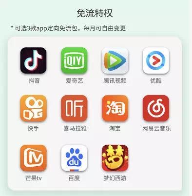 > 每月可自选3款应用免流使用,次月可进行更换应用