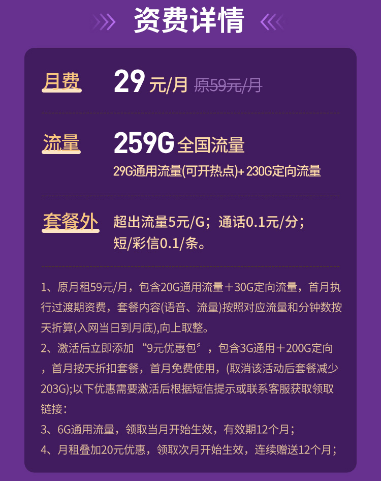 > 230G定向流量+29G通用流量,套餐外流量国内流量5元/GB