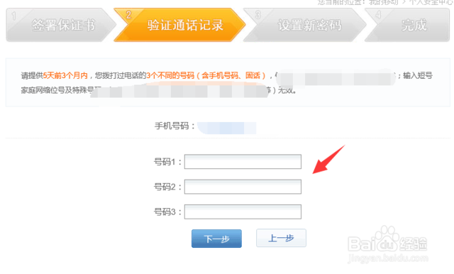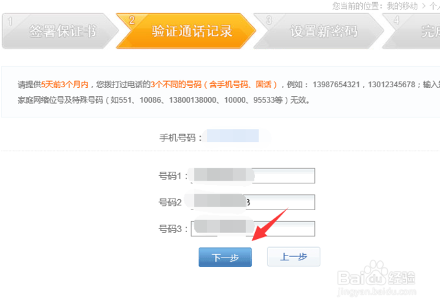 然后,我们进入到验证通话记录选项页面,这时我们要依次填入5天前3个月内拨打过的三个号码,记住号码不能相同哦,三个号码填好后,点击下一步按钮。