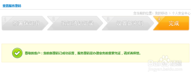 点击提交后,页面弹出“尊敬的客户:您的新密码已成功设置,服务密码是办理业务的重要凭证,请妥善保管。 ”提示信息,另外我们的手机也会收到密码重置成功的信息。