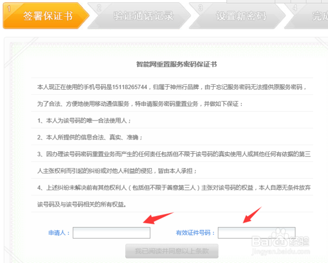接着,进入到签署保证书页面,在下方我们填入我们的名字和身份证号码,并点击“我已阅读并同意以上条款”按钮。