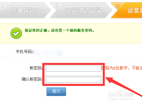 当我们的验证资料正确后,进入设置新密码的输入提示窗口,这里我们重新设置一个新密码,然后点击“提交”。