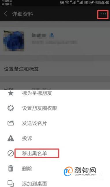 弹出的界面,我们点击右上角的按钮,弹出的界面,我们点击移出黑名单,这样我们就恢复了该好友了。