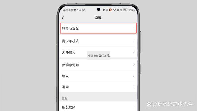 2、在“设置”页面点击“账号与安全”。