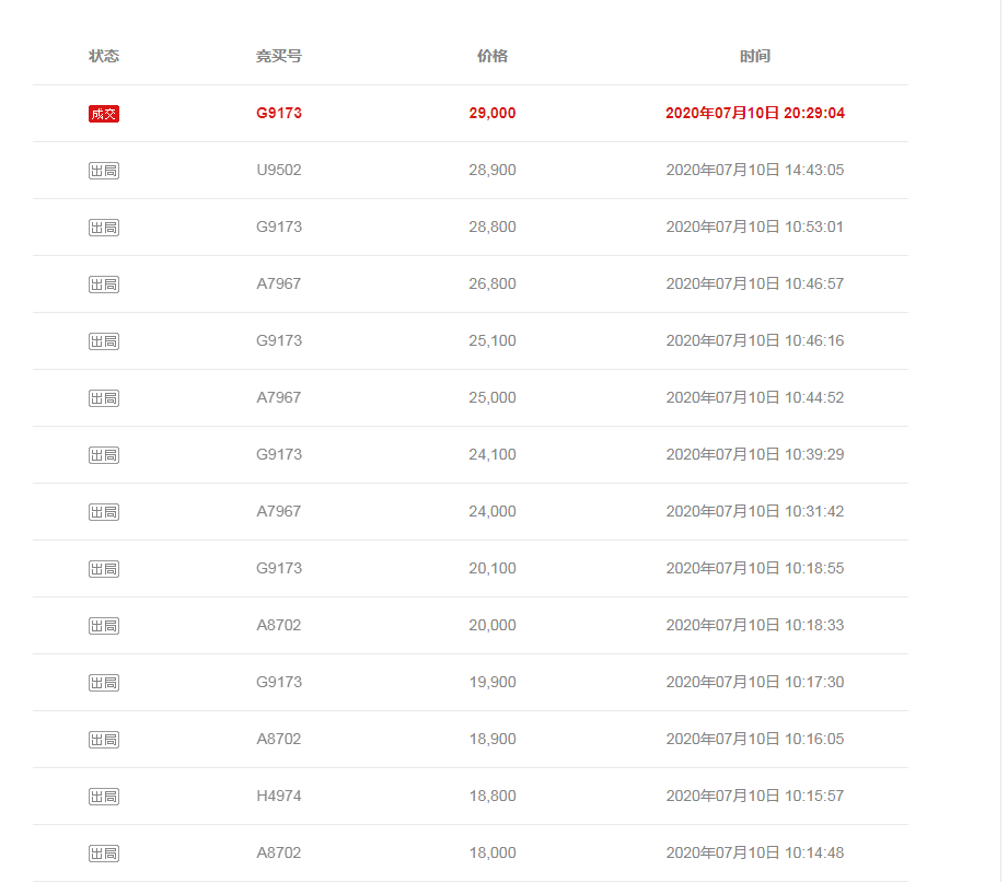 2020年7月11日上午10时,山东聊城移动号码13806352068拍卖结束,该号码起拍价500元,加价幅度100元,拍卖过程中共32人报名,5429人围观,在经历55轮激烈的竞拍后,号码最后以29000元成交。