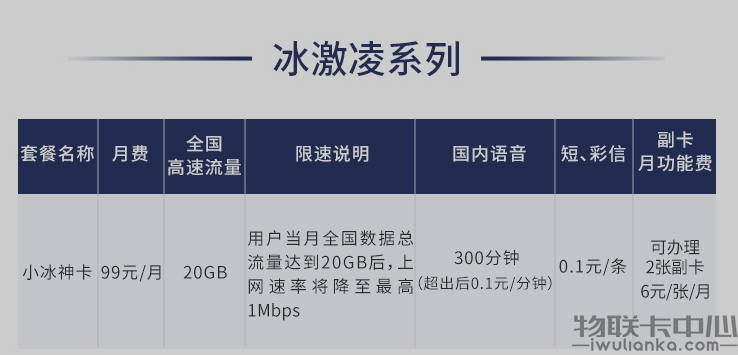 小冰神卡的月租是99元不限流量,超过20G上网速率将降至最高1Mbps,含有300分钟通话时间,适合需要通话套餐的人。