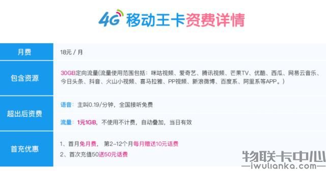移动王卡月租低至9元,除了每天1元1G全国流量,不用不花钱外,还有30G的专属定向流量:抖音、今日头条、爱奇艺、优酷、腾讯视频、咪咕等12款APP可用。一直嫌弃移动套餐贵的可不能错过这个套餐,可以说是移动流量里最划算的了。
