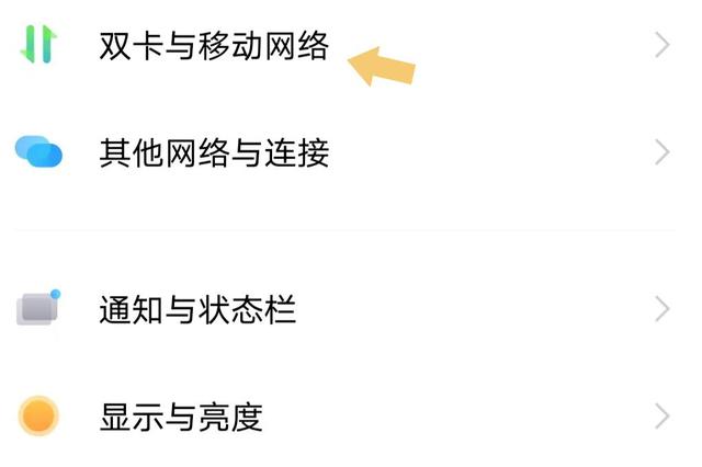 进入“设置”以后,下拉菜单找到“双卡与移动网络”。如下图: