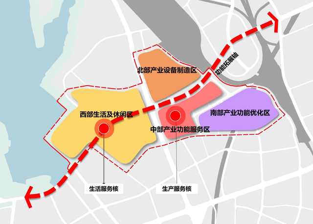 “四区”:西部1个生活及休闲片区以及北部、中部和南部3个产业片区。
