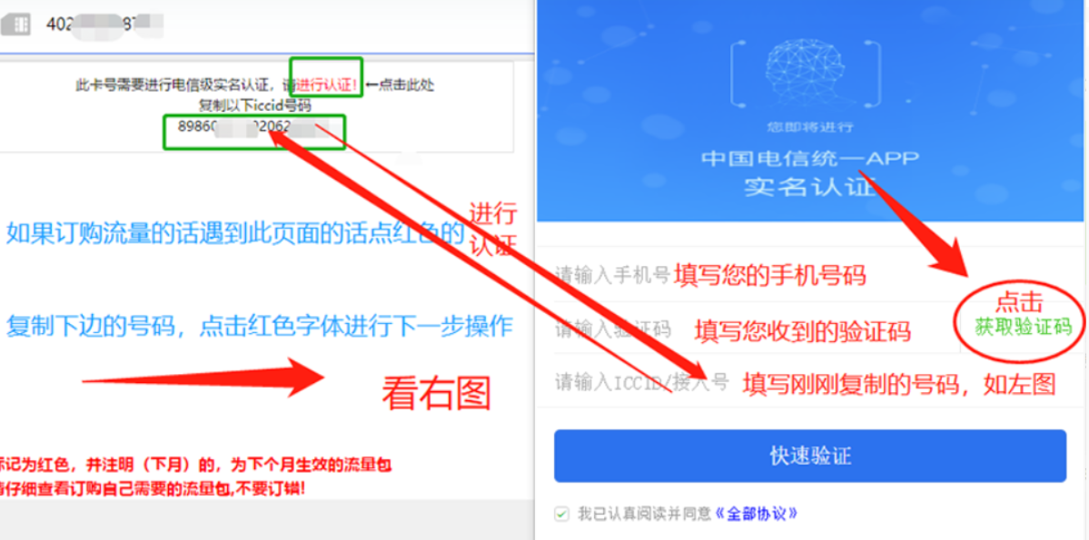 电信无限流量卡用户在激活手机卡时时,如果出现上图提示说明需要进行电信级实名制认证,请按照下面流程进行实名认证,流量卡实名认证通过后可以继续订购流量包: