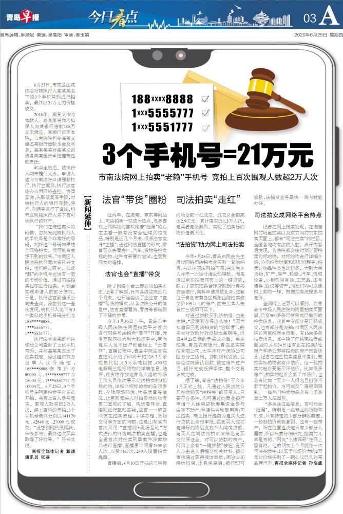 6月23日,市南区法院依法对被执行人高某某名下的3个手机号码进行拍卖,最终以21万元的价格成交。