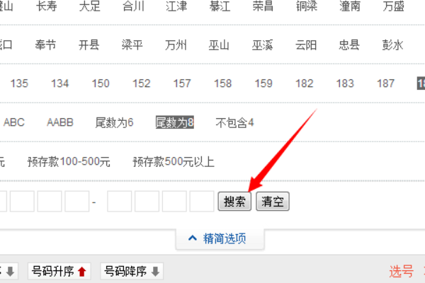 6、在筛选结果中寻找,看是否有想要的号。如果没有,可以过一段时段来看看,因为毕竟是免费的东西,有运气成份。如果有充裕的资金,直接可以预存高额话费拿靓号。