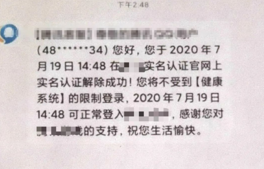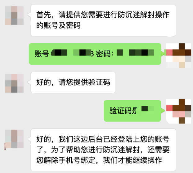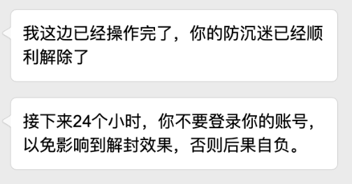 但“客服”再三嘱咐小李,这期间不要登录自己的游戏账号,也不要登录绑定游戏账号对应的社交平台账号,并且还像模像样地给小李发送了一条“防沉迷解封成功”的提示。小李信以为真,乖乖地听从了“客服”的嘱咐,在此期间没有登录账号。