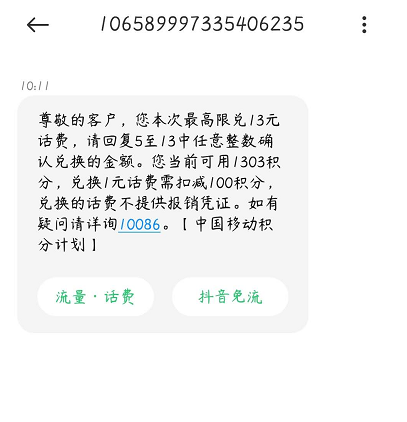 中国移动积分换话费短信怎么发