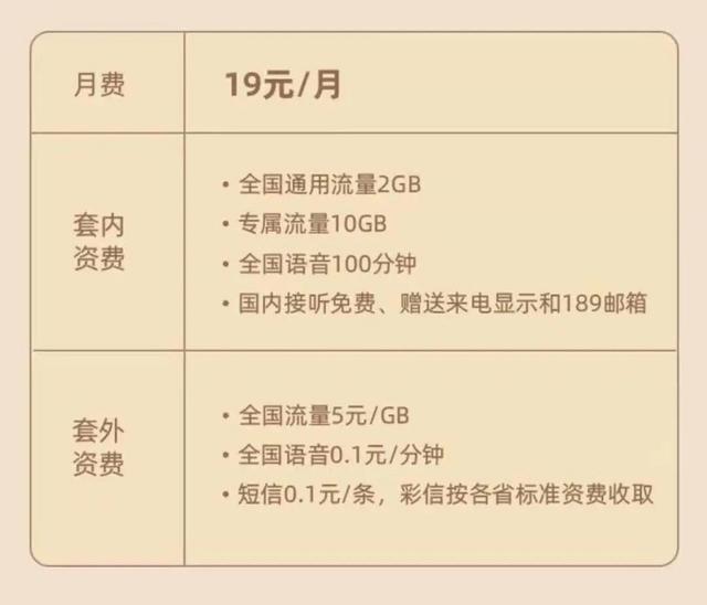国内接听免费,全国可拨打的语音100分钟;全国通用流量2GB;专属流量10GB,专属的App包含抖音短视频、抖音火山版、快手、网易云音乐、爱奇艺视频、腾讯视频、优酷视频、西瓜视频等国内定向流量。