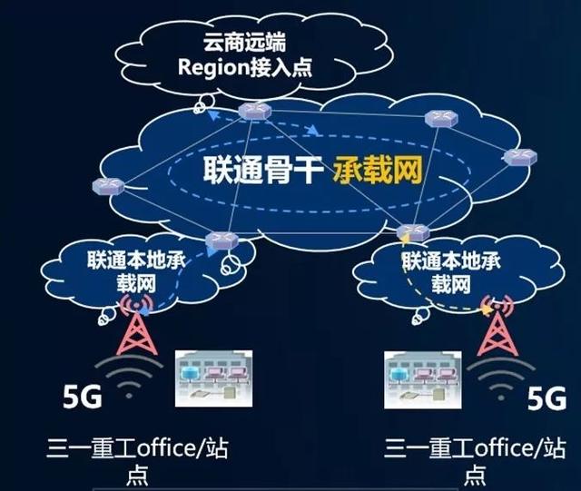 方案中使用了中讯院与5G创新中心联合研发的5G云专线产品,通过5G无线网络提供专线接入,经联通高品质承载专网入云,充分保障了三一重工外场办公、跨域专线入云、多点组网等通信需求。