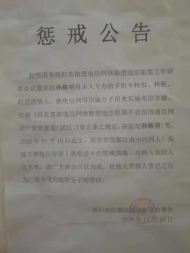 依据《河北省涉电信网络新型违法犯罪不良信用通信网用户管理意见(试行)》和《中国人民银行关于进一步加强支付结算管理防范电信网络新型违法犯罪有关事项的通知》,以《惩戒公告》明确告知被惩戒人员因将本人开办的手机卡、银行卡转卖、转租、转借给他人,而被电信网络诈骗分子用来实施电信网络诈骗犯罪,受到2年内只保留1张手机卡、5年内暂停银行账户非柜面业务和支付账户所有业务的惩戒。