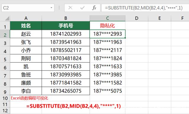 C2单元格输入:=LEFT(B2,3)&"****"&RIGHT(B2,4)
