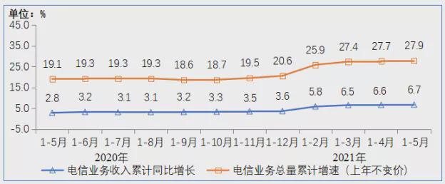 工信部公布《2021年1-5月通信业经济运行情况》。1-5月,电信业务收入累计完成6127亿元,同比增长6.7%,两年平均增速为4.7%,增速较疫情前的2019年同期提升6.4个百分点。按照上年不变价计算的电信业务总量为6578亿元,同比增长27.9%。