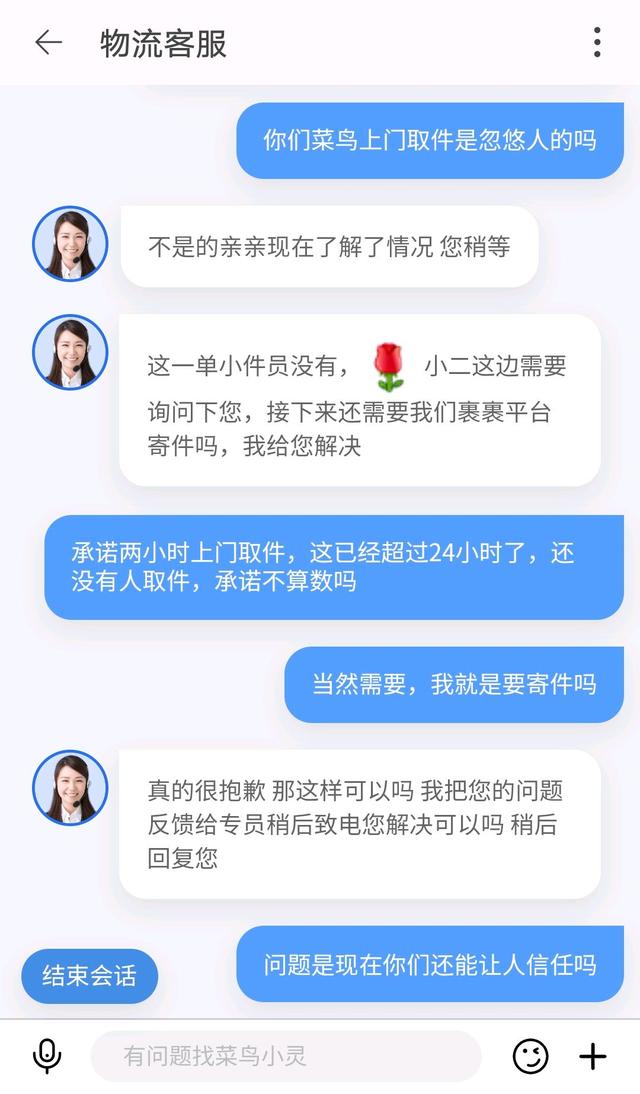 菜鸟客服了解情况后,表示上门取件的服务承诺是算数的,取消的预约订单会帮杨先生重新下单,并承诺在两小时内安排快递员上门取件。既然客服帮助处理,杨先生也没说什么,只要有人取件,再等等也无妨,谁知道这一等从上午等到下午,下午等到晚上,一天过去了,也没有快递员过来取件