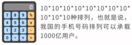 按照11位手机号码进行排列组合,我国的手机号码可以容纳一千亿个不同的号码。是不是超酷呀~