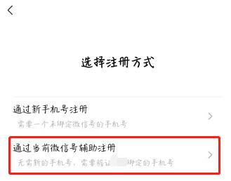 在进入到新的注册页面后,会出现两个选项:通过新手机号注册和通过当前微信号辅助注册。