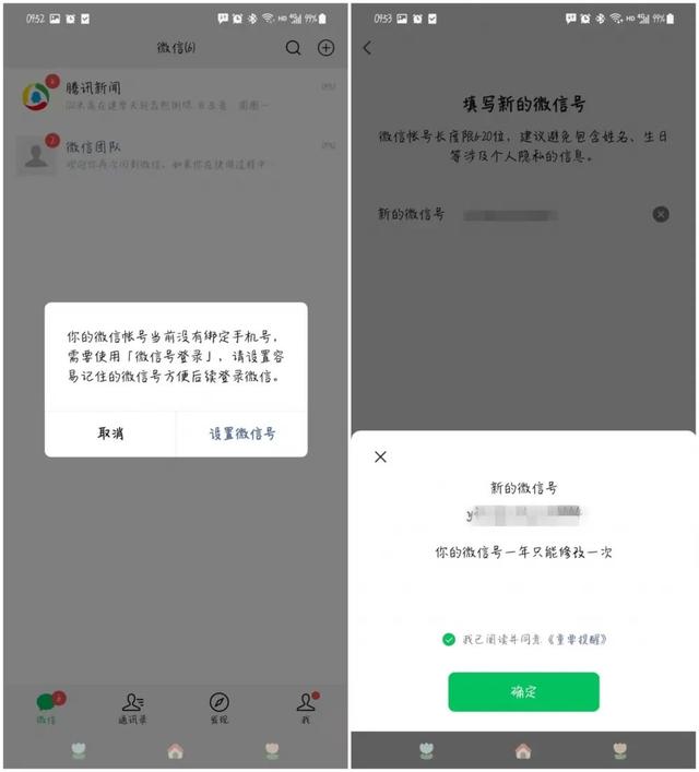 设置好几本内容后,就能进入微信的聊天界面了,新账号第一次登陆会提示“由于没有手机号绑定,所以需要设置微信号”,以便后续登陆。
