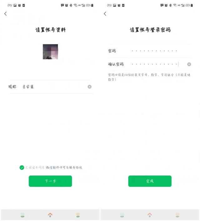 在同一微信的相关条款后,就能进入新账号设置的页面了,头像和昵称需要在新页面中首先设置好,其次会让你设置新账号的登录密码▼