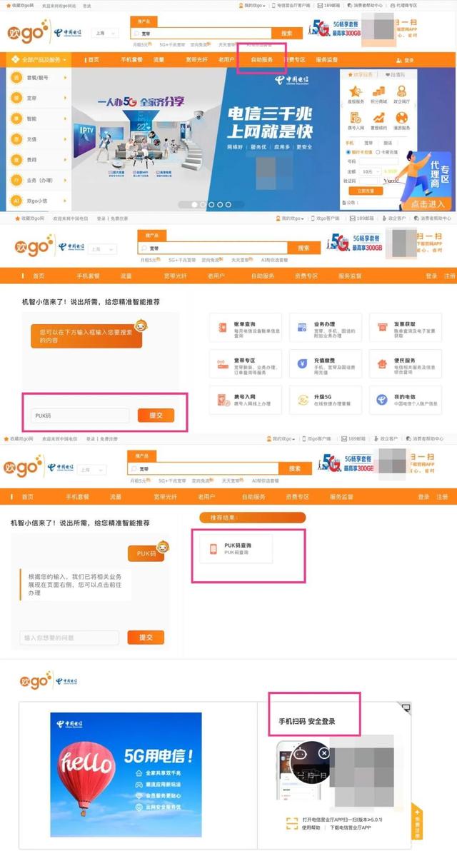 线上也可以查询,以电信用户为例,打开中国电信网上营业厅PC端,在主界面中找到“自助服务”,在页面底部找到生活服务-PUK码查询即可。不过,需下载“中国电信营业厅”App,通过手机扫码安全登录。(也可先登录后直接查询)