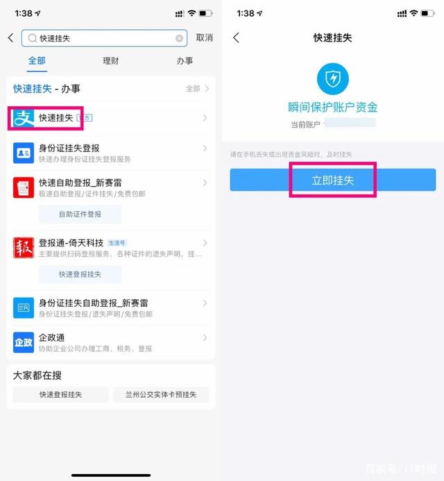 支付宝是在首页搜索“挂失”,点击“快速挂失”。
