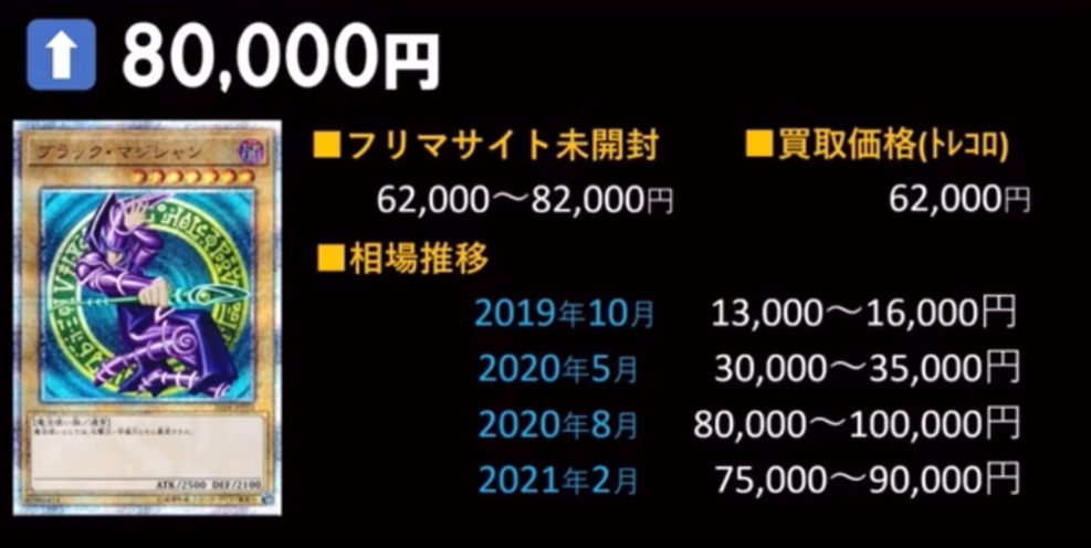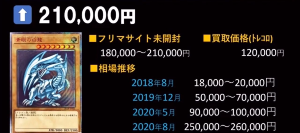这里有一个非常有意思的数据,在2018年的时候,一张青眼白龙的价格约为18000日元到20000日元之间。仅仅是过了两年,价格直接就飙升至25万日元,每年上涨的速度都在增加。2020年5月到8月,也就是日本开启第一次补贴的时候,价格直接翻了2、3倍。后面价格也慢慢恢复了正常。