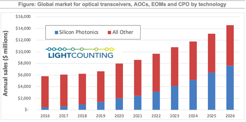 不过,LightCounting指出,新的更高速产品、新的供应商和流片厂的出现,以及CPO应用的发布,都表明硅光应用已经在转折点上。