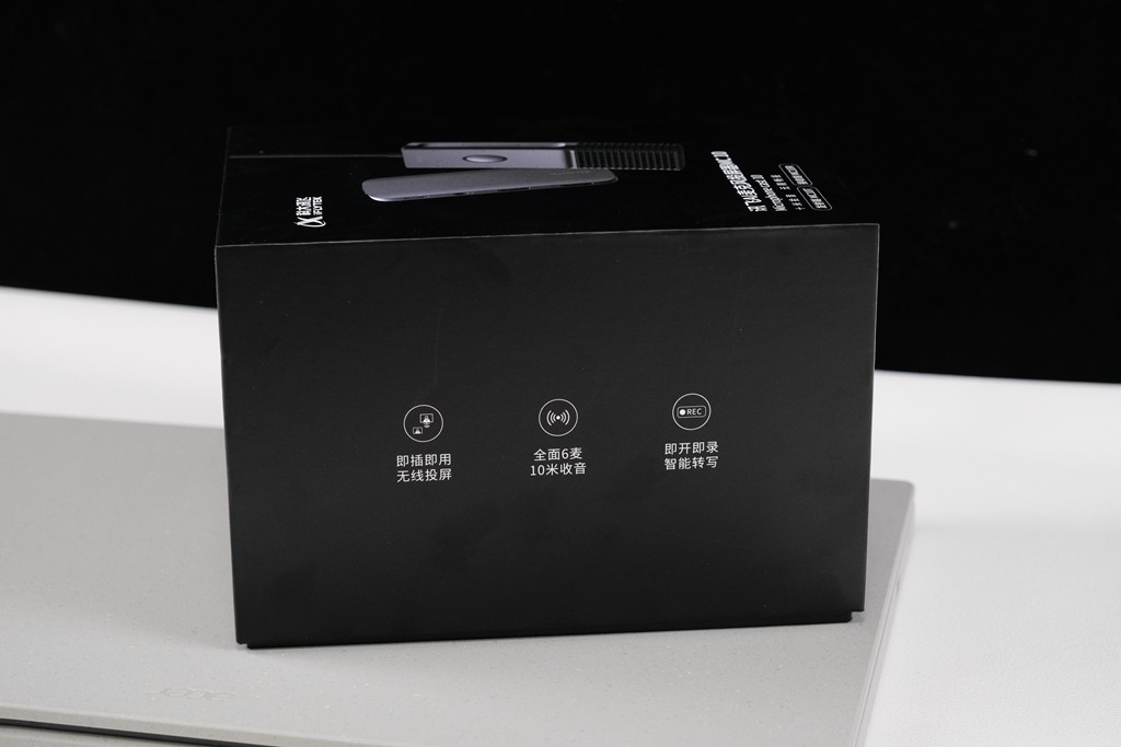 当我拿到这么一块“黑家伙”的时候,我也是一头雾水的,盒子上写着“讯飞AI麦克风投屏器MC10”,并且标注着“十米拾音”、“无限畅投”这几个关键字,听起来确实是比较陌生。