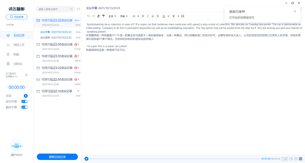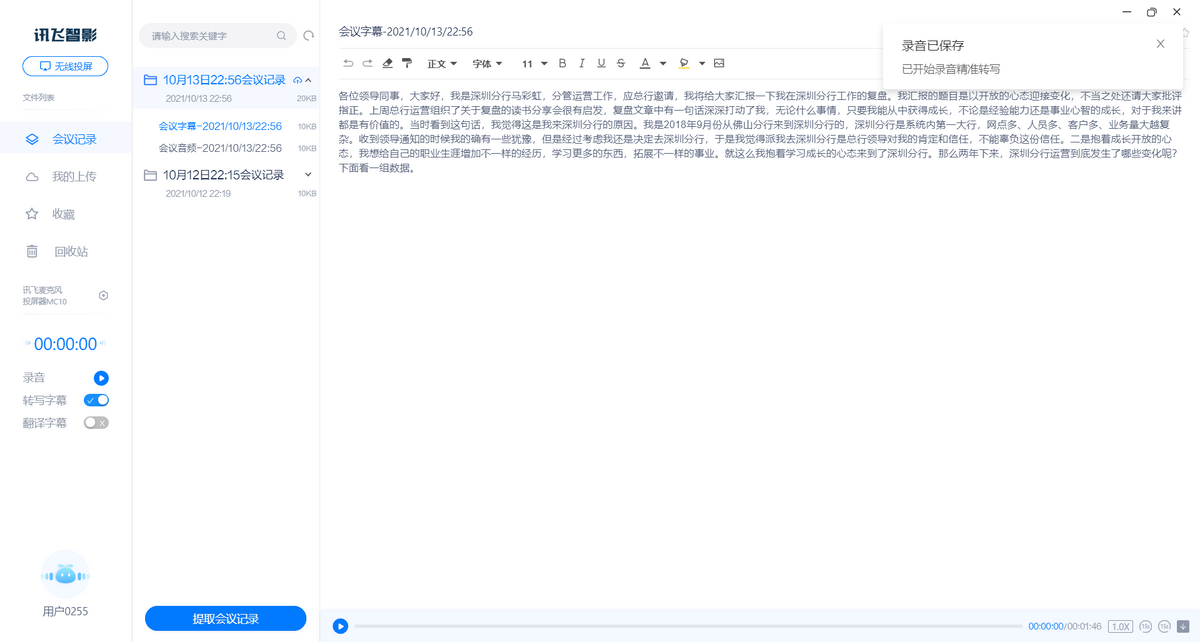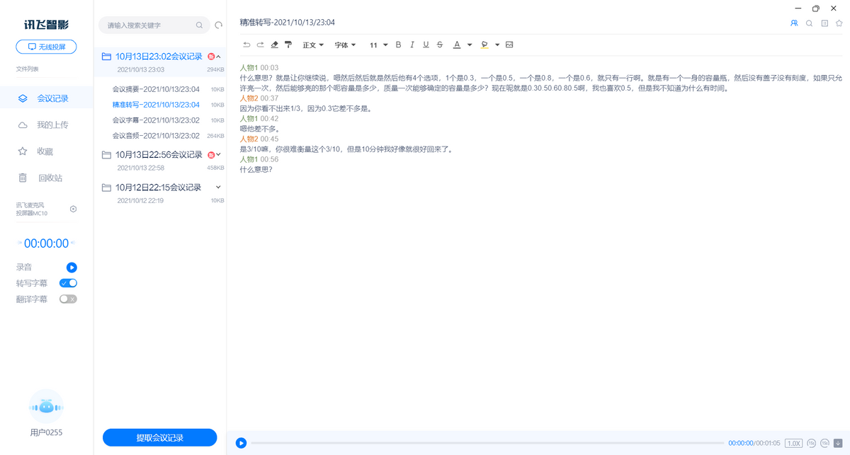 最有意思的是,讯飞AI麦克风投屏器MC10可以针对发言人进行分别展示,当不同的发言人可以快速切换人物,实现会议结束后的重要场景还原。