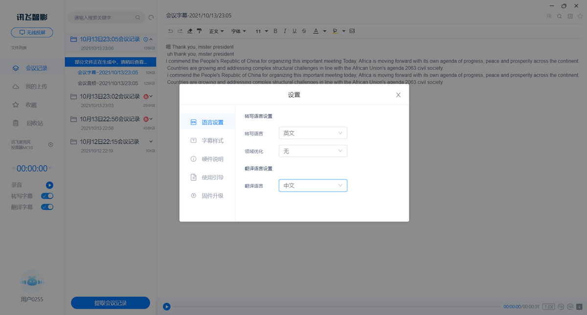 除了转写以及发言人分类之外,AI麦克风投屏器MC10还支持翻译功能,可以针对8种外语、12种方言进行翻译,而且翻译的速度基本能做到即说即翻,讯飞极为强大的语音技术一直被沿用到投屏器之中。