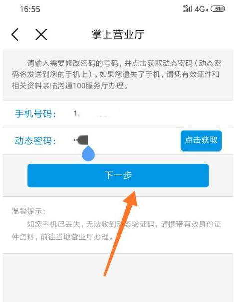 进入服务密码界面以后,输入手机号码和动态密码(动态密码点击获取会以短信发送发到手机),然后点击下一步。