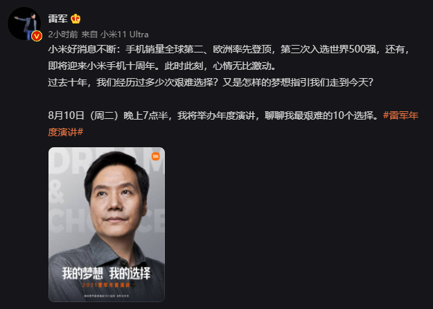 同时雷军宣布,将在8月10日晚上7点半,举办一场年度演讲,聊聊雷军最艰难的10个选择。