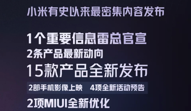 在宣传“直面会”时,小米放出了一张海报,并表示这将是小米有史以来最密集的内容发布,1个重要信息雷总官宣、2条产品最新动向、15款产品全新发布、2部手机影像上映、4项全新活动预告、2项MIUI全新优化。