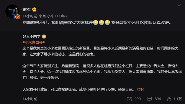 雷军宣布4个好消息,但昨日“直面会”让米粉吐槽,负责人道歉